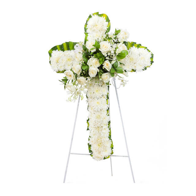 We know how difficult it may be planning funeral flowers for a loved one and we are here to help you to the best of. This style of funeral flower comes in the shape. Standing funeral sympathy crosses of flowers with roses. White carnation funeral cross easel with a group of red roses in the middle of the cross cascading down. Christian wooden cross decorated with flowers and leaves.